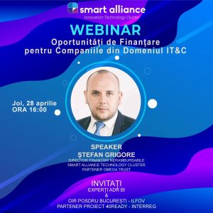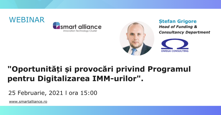 The first event in Smart Alliance’s 2021 webinar series focused on funding opportunities for SMEs through the POC 2.2.2 Digitalization Program. Led by our member Omega Trust – Omega Consulting Division, and facilitated by Ștefan Grigore, the session provided practical insights into how IT&C companies and SMEs can access non-reimbursable funds.